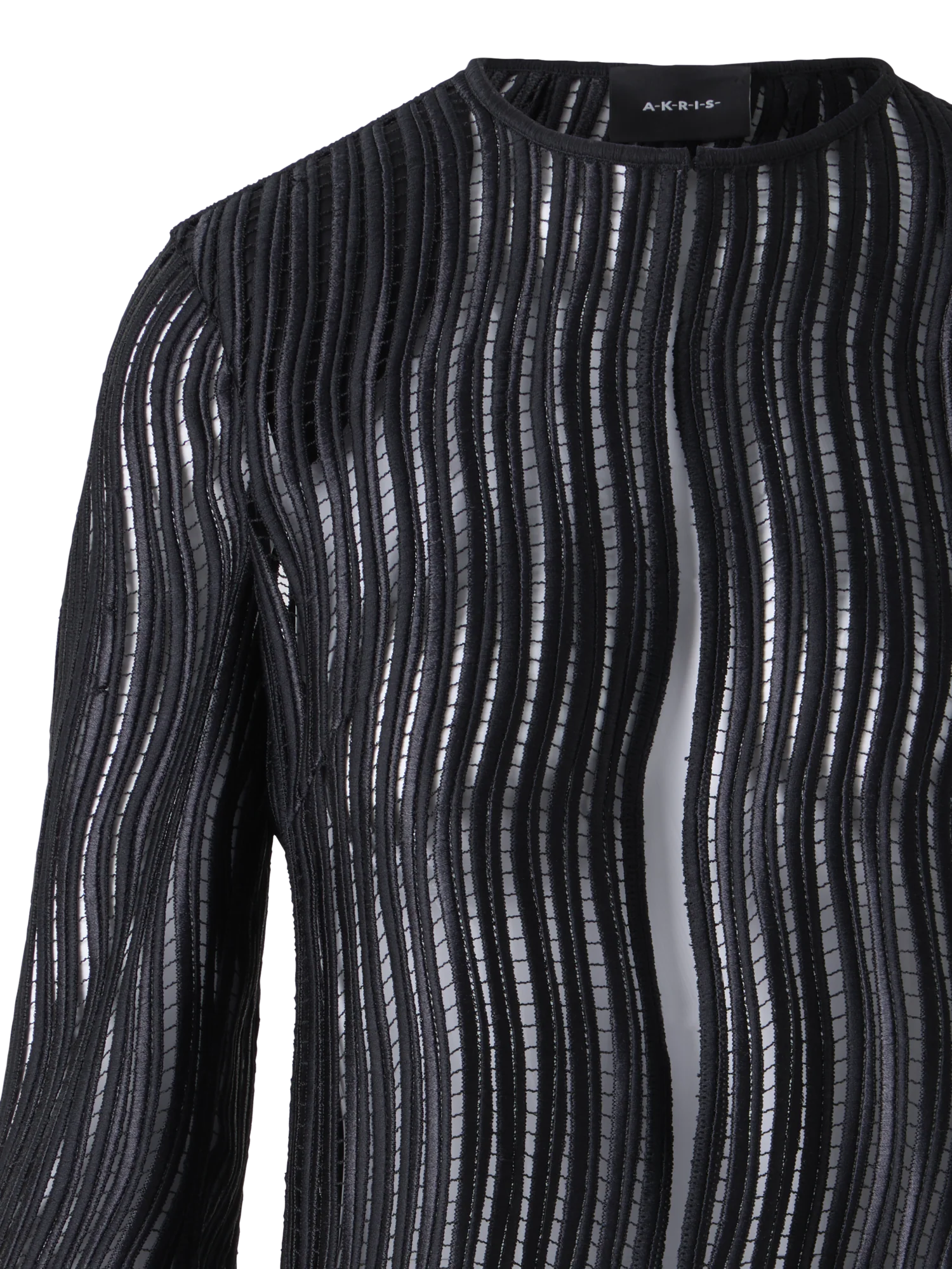 This long jacket is crafted in Techno Wave Guipure, where undulating lines create a sculptural surface with depth and movement. The sheer, graphic texture is balanced by a clean crew neckline and a discreet single hook closure, lending composure to the elongated silhouette. Finished with seam pockets for subtle functionality, it is a refined statement layer that captures Akris' mastery of modern structure and material-driven elegance.