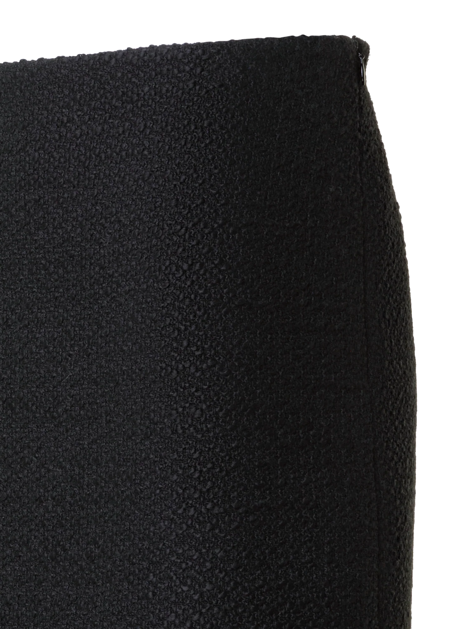 In plain bouclé tweed, this mini skirt recalls the sleek femininity of the 1960s with a modern twist. A fringed hem introduces subtle movement, while the side zip closure refines the silhouette, balancing timeless tailoring with contemporary ease.
